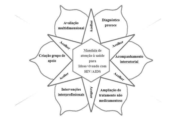 A partir do itinerário apresentado foi construída uma proposição de mandala, que traz problematização sobre a reorganização da rede de atenção à saúde focada nos nós críticos anunciados pelos idosos com HIV/Aids durante os seus percursos terapêuticos. Inicialmente há que destacar a necessidade de trabalhar com modelos ampliados de assistência durante todo o acompanhamento dos idosos pelos serviços. A avaliação multidimensional deve ser utilizada em todos os processos de investigação de saúde em idosos, com diálogo e escuta qualificada, em que se aborde sobre a sua vida sexual, a fim de identificar precocemente as infecções sexualmente transmissíveis neste grupo e assim serem avaliadas e tratadas precocemente de forma multifatorial, levando em consideração todo o contexto que envolve a saúde dos idosos.