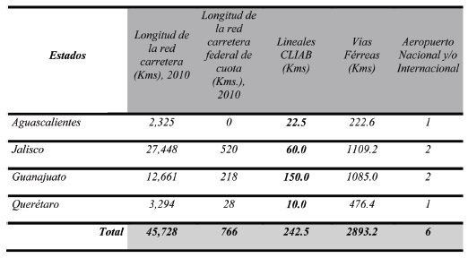 El cuadro 1 muestra la longitud y la cobertura de la red carretera de las cuatro entidades federativas de nuestra zona de estudio comprendiendo una longitud de 45,728 Kms, de los cuales 766 Kms alcanza la cobertura de carreteras federales, mientras que el CLIAB comprende una longitud de recorrido de 242.5 Kms; a su vez, cuenta en su trayectoria con 2,893.2 Kms de vías férreas y con seis equipamientos aeroportuarios y una conectividad con el puerto de Lázaro Cárdenas, Michoacán, y el puerto de Manzanillo, Colima. Esto indica que el CLIAB mantiene una interacción directa con terminales privadas automotrices, por lo tanto, las ciudades buscan tener una conexión cada vez más directa con las grandes corporaciones, es decir, los corporativos ven una ciudad atractiva para desarrollar sus funciones centrales, hacen que ocupe un lugar privilegiado en la red urbana mundial denominada nodos de interacción económica. Por lo anterior, es indispensable que mantengamos una visión que constituya el posicionamiento estratégico de una organización y ubicación de emplazamientos de clústeres industriales de alta tecnología determinando los coeficientes de ocupación y de utilización del suelo, y la imagen que desea ofrecer su ciudad tanto hacia el exterior como hacia el interior.