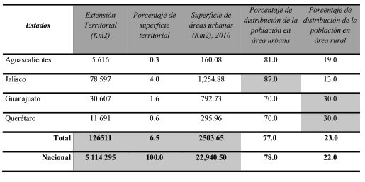 En el cuadro 2 se muestra una ocupación de extensión territorial de 126,511 Km2, que equivale al 6.5% de su superficie a nivel nacional, con un 77% de su población que vive en áreas urbanas y el 23% en áreas rurales. El suelo predispuesto lateralmente sobre el eje carretero potencializa un rendimiento mayor de los coeficientes de ocupación y de utilización del suelo, conformando una plataforma de infraestructura y de equipamiento industrial con la operatividad de desplazamientos pendulares de la logística comercial de servicios. Además, el suelo de las reservas territoriales dejó de ser propiedad comunal; en algunos tramos carreteros mantiene la propiedad municipal, estatal o dominio federal o privado, es decir, el suelo adquirirá un valor como medio o condición para la producción, especialmente cuando se utiliza para el desarrollo industrial.