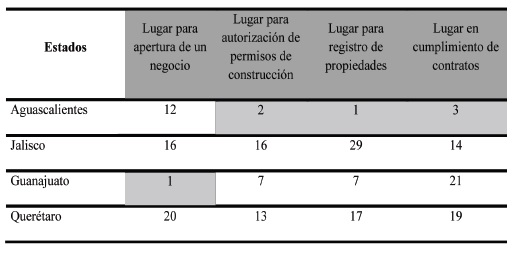 En el cuadro 3, el Estado de Guanajuato se encuentra en primer lugar para la apertura de negocios; Aguascalientes en segundo lugar para la autorización de permisos de construcción, en primer lugar para registro de propiedades y en tercer lugar en cumplimiento de contratos, es decir, tiene un enorme potencial para la apertura de negocios y autorizaciones sobre el CLIAB, así como para conocer los criterios, las condiciones y los términos bajo los cuales se autorizan los desarrollos industriales y consultar la normatividad vigente respecto a particiones, fraccionamientos, divisiones, relotificaciones, cambios de regímenes de propiedad, esto es, el análisis comparativo entre la normatividad aplicada al momento de la autorización y la ejecución real de las obras de urbanización que inciden directamente en la configuración de los elementos que dividen el espacio público urbano del espacio privado industrial.