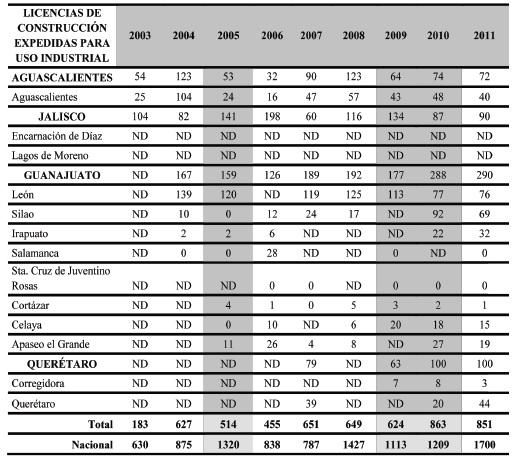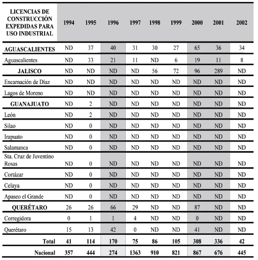 El cuadro 4 muestra las autorizaciones de licencias de construcción dentro del periodo que da inicio formal a la apertura comercial del TLCAN 1994- 2002, reflejando la predisposición de autorizaciones que se han expedido para uso industrial; los trece vectores geográficos interactúan de manera directa e indirecta con el Eje Interior del Pacífico; resalta Aguascalientes con una estimación de autorización de 300 licencias de construcción en ese lapso, de las cuales 109 se llevaron a cabo en el municipio de Aguascalientes, donde en el 2000 se expidió un máximo de 65 licencias para el uso industrial.