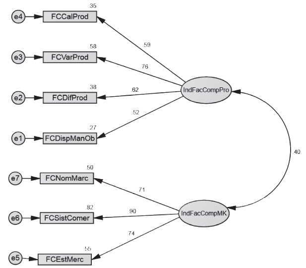 Comprobada la fiabilidad y la validez de los constructos, se contrastó si el modelo teórico se corresponde con los factores y las dimensiones obtenidos a partir de la información empírica, lo cual se llevó a cabo mediante el Modelo de Ecuaciones Estructurales (Structural Equation Modeling) que, a partir de métodos estadísticos multivariantes, permite estimar el efecto y las relaciones entre múltiples variables. Los modelos de ecuaciones estructurales fueron generados mediante la técnica de máxima verosimilitud. El modelo propuesto se denominó “Factores de Competitividad de las Empresas”, con el cual se valora la percepción de los empresarios respecto de sus principales factores de competitividad, siendo medido con base en dos variables latentes: los factores de competitividad relacionados con el producto y los factores de competitividad que guardan relación con las estrategias de mercado; los resultados obtenidos se presentan en el diagrama 1, en el cual se advierte que existe una relación directa entre las dos variables latentes, dada una covarianza de 0.40.