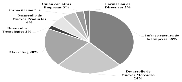 En general, las cargas factoriales son mayores a 0.50, indicando la correlación entre las variables latentes y los indicadores; los resultados obtenidos en la correlación múltiple cuadrada indican que tienen mayor peso los factores de competitividad relacionados con las estrategias de mercado, y la que refiere que el empresario percibe como mayor factor de competitividad sus sistemas de comercialización. Así, el 82.0% de la varianza de la variable “Sistemas de Comercialización” se explica por el factor de estrategias de mercado, en la posición opuesta se tienen las variables de “Disponibilidad de Mano de Obra Calificada” y “Calidad de Producto” que registran coeficientes de correlación de 0.27 y 0.35 respectivamente, asumiéndose que el empresario en BCS no considera la calidad del producto y/o servicio como uno de los principales factores que genera competitividad a la empresa; de hecho, tan sólo el 35% de la varianza de la variable “Calidad del Producto” está explicada por el factor de competitividad del producto, es decir, el empresario continúa apostando más a los sistemas de comercialización que a las cualidades de su producto, como lo es la calidad y la diferenciación del bien o servicio ofertado, situación que –finalmente– implica un fortalecimiento de las actividades terciarias en BCS. Respecto a la inversión realizada en los últimos años para intentar elevar su competitividad, las empresas refieren que sus inversiones se han dirigido principalmente a: