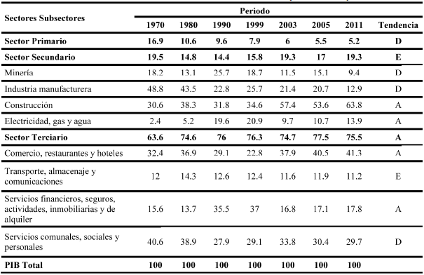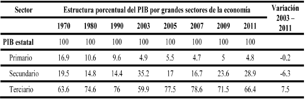 En la actualidad, el sector terciario comprende las actividades económicas de mayor participación y dinamismo en la estructura económica del Estado; de esta manera, en el periodo 1970-2011 se observa una tendencia a la consolidación de las actividades relacionadas con el comercio, los restaurantes, hoteles y servicios inmobiliarios, siendo evidente el retroceso de los indicadores del sector primario respecto de su participación en el PIB estatal; lo anterior se analiza en un entorno en el cual: