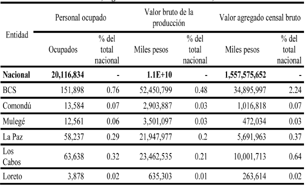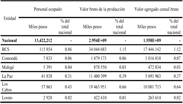 La baja participación que registra BCS en el contexto de la economía mexicana queda de manifiesto al observar que su participación en el PIB nacional fue del 0.63% en 2011 (INEGI, 2012b); además, se reportan valores inferiores al 1% en los indicadores Personal Ocupado y Valor Bruto de la Producción y del 2.24% en el Valor Agregado Censal Bruto (VACB), indicadores que –al interior de la entidad– muestran grandes diferencias territoriales con máximos en los municipios de Los Cabos y La Paz (ver cuadro 3).
