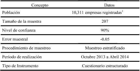 La aplicación del cuestionario final se realizó entre octubre de 2013 y abril de 2014; la codificación, la validación y el análisis de los datos cuantitativos obtenidos a partir de este instrumento de investigación fueron registrados, analizados y validados mediante el programa estadístico “Statistical Package for the Social Scienses” (SPSS) versión 21. La población sujeta de estudio (como unidad de análisis) corresponde al universo de empresas de BCS registradas por INEGI (2012a); el tamaño de la muestra se obtuvo con la técnica de muestreo estratificado, considerando como factores de estratificación la localización por municipio y el sector económico en que se ubica la empresa. Del total de la muestra, el 16.5% corresponde a 34 empresas del sector agropecuario; el 13.5% a 28 empresas pesqueras; el 1.9% a 4 mineras; el 14% a 29 de comercio; el 11% a 23 industrias y el 43% a 89 empresas de servicios.