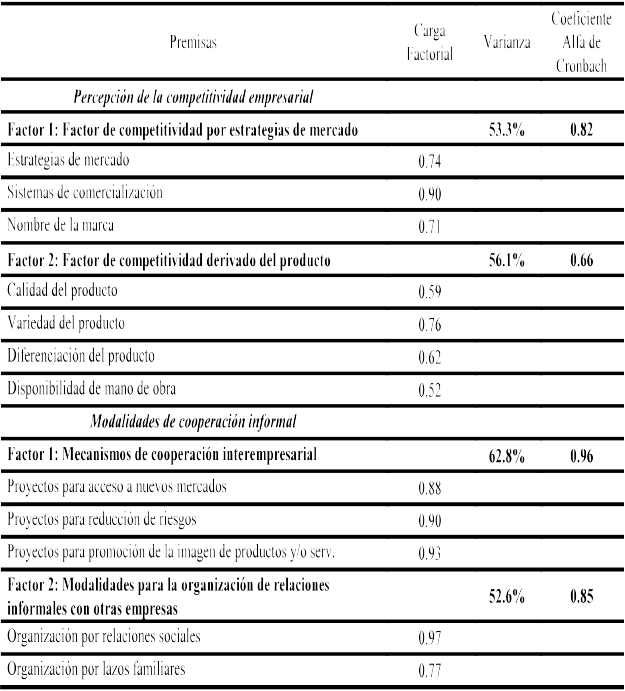La validez del constructo se formuló mediante el Análisis Factorial Confirmatorio (AFC), en cuyo caso el procedimiento aplicado resultó en cuatro factores con cargas factoriales superiores a 0.50, lo que indica una correlación de las variables sujetas de estudio y los factores obtenidos. Se procedió a realizar una última depuración, con el objetivo de excluir los ítems o indicadores que no satisfacen los requisitos mínimos de calidad exigidos por los métodos estadísticos. En el caso del constructo de competitividad empresarial, se eliminaron las variables que valoran la percepción de factores de competitividad de los empresarios en torno a desarrollo tecnológico, costos, precios y ubicación. En el de cooperación empresarial, se eliminaron las variables que valoran la percepción en relación con las modalidades de cooperación de los empresarios referidas a proyectos conjuntos de especialización, de mejora en la calidad e innovación y de desarrollo tecnológico.