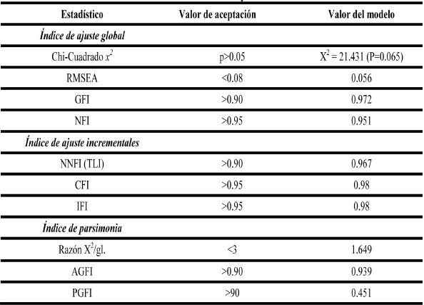 Los estadísticos de bondad de ajuste y evaluación del modelo deben aplicarse mediante una evaluación conjunta de los estadísticos obtenidos. Los índices de ajustes globales: chi cuadrada, RMSEA, GFI y NEI indican un ajuste razonable del modelo. Los índices de ajuste incremental: NNFI, CFI e IFI también sugieren la aceptación del modelo, pues los valores obtenidos señalan una correcta estimación. En cuanto a los ajustes de parsimonia, la razón /gl y el AGFI corroboran la aceptación del modelo; de esta manera, de diez pruebas realizadas al modelo, nueve apoyan la aceptación, incluso con coeficientes muy por encima de los valores críticos. Por tanto, es posible inferir que existe relación entre las dos variables latentes y los indicadores.
