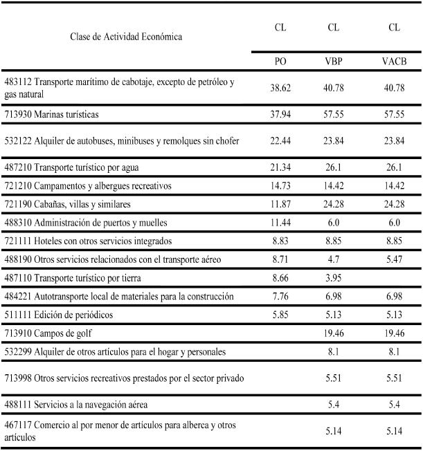 Del análisis realizado por clase de actividad económica fue posible identificar la existencia de condiciones para el desarrollo (o su posible fortalecimiento) de dos tipos de actividades económicas terciarias, que cuentan con potencial para el fomento de SPL y el fortalecimiento de la red de relaciones interramales. Un primer tipo está asociado a aquellas actividades con un CL superior a 10 unidades en –al menos– dos de los indicadores censales de INEGI (como marinas turísticas, transporte turístico por agua, cabañas, villas y similares, alquiler de autobuses, minibuses y remolques, campamentos y albergues recreativos y campos de golf).