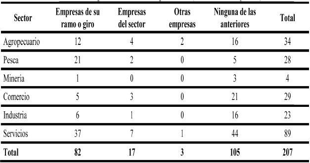 Por el contrario, más de la mitad de los entrevistados (50.7%) manifiesta no tener ningún tipo de mecanismo de cooperación formal o informal con otras empresas. Este último indicador refleja una limitada articulación y cooperación entre los actores del tejido empresarial de BCS, situación que no favorece la formación de SPL, los cuales parten de la premisa que su implementación se origina en acuerdos económicos y/o proyectos de cooperación empresarial.