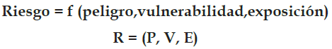 La definición más aceptada por CENAPRED (2012) sobre el riesgo está en función de tres factores: la probabilidad de que ocurra un fenómeno potencialmente dañino, es decir, el peligro, la vulnerabilidad y el valor de los bienes expuestos. Esta definición se expresa en la ecuación: