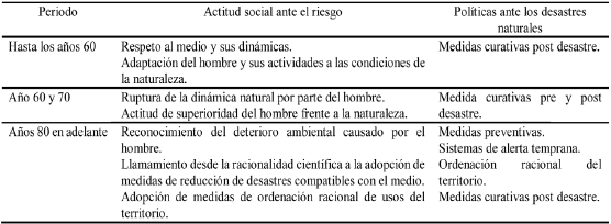 En el cuadro 1 se presentan los cambios en la consideración de las sociedades de la peligrosidad de los fenómenos naturales y las políticas implementadas antes los desastres.