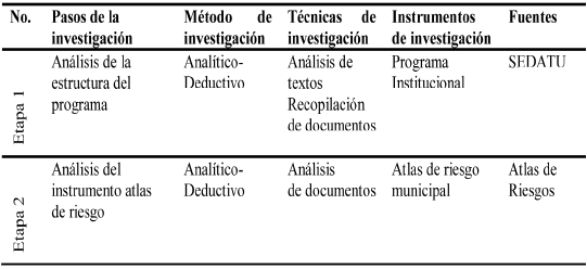En la etapa dos se comparan los contenidos generales y específicos señalando los elementos clave de los atlas de riesgos; se sigue la metodología de investigación descrita en el cuadro 3, tomando como referencia los presentados por la SEDATU.