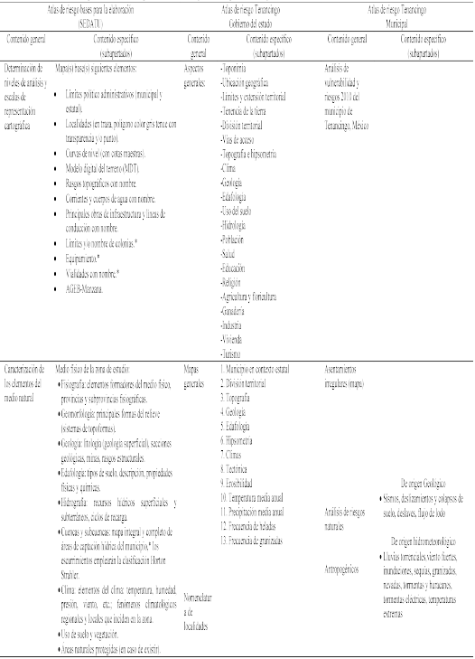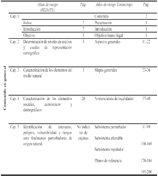 En la revisión del contenido general del atlas en comparación se advierten diferencias en la manera de presentar apartados y sub apartados. El atlas de riesgos de Tenancingo le denomina subsistema perturbador, afectable, regulador y referencia. Esto se muestra en cuatro subsistemas al final del documento, donde se habla de la relación con la interacción de hombre- naturaleza y, por ende, de los lugares propensos a ser afectables con cualquier fenómeno perturbador. Además se describe y clasifica para su regulación y/o prevención, control y protección a los agentes afectables. Lo anterior se da a través de las instituciones, normas y programas. La última parte de este subsistema perturbador hace referencia a los mapas, ya que en ellos se pueden representar los fenómenos tanto geológicos como hidrometeorológicos.