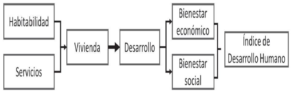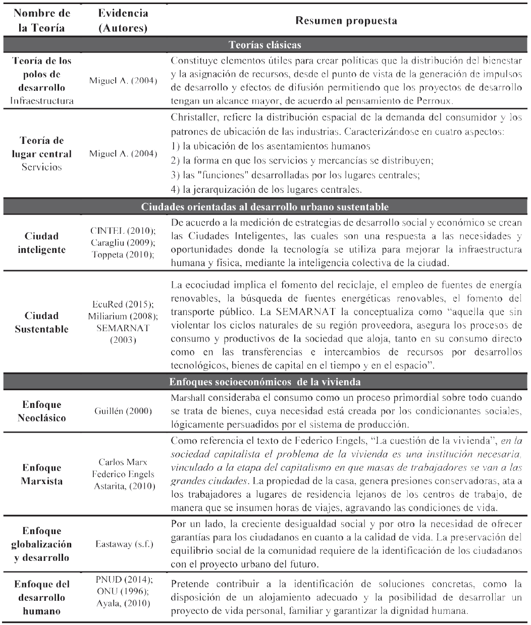 El concepto de vivienda es un término complejo que posee aspectos culturales determinados por un contexto histórico-social que dificultan entenderlo de una forma única (Haramoto, 2002; Connolly, 2006; Villavicencio, 2000; Cortés, 1995; Ball, 1987). La palabra vivienda provoca en las personas una inmediata representación esquemática asociada con el hábitat (Rugiero, 2000). La relación que muestra el desarrollo con la vivienda se fundamenta en la concentración territorial de éstas en las ciudades y puede considerarse que su aglomeración consolida y promueve el desarrollo e influye en el medio ambiente dificultando en ocasiones la sustentabilidad de las propias ciudades; en el cuadro 1 se muestran las teorías de la vivienda enfocadas al desarrollo.