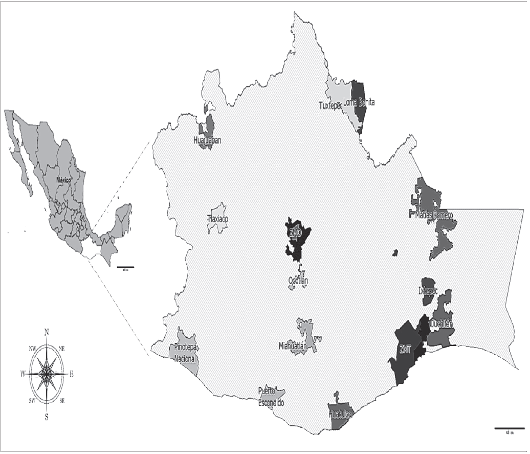 El Estado de Oaxaca se compone de 570 municipios. Se localiza hacia el sur de México en las coordenadas 17° 0’ latitud Norte, 96° 47’ longitud Oeste, y a una altitud de 1,560 metros sobre el nivel del mar. Cuenta con 14 ciudades con más de 15 mil habitantes, analizadas en el presente artículo (INEGI 2011) (figura 2). Es el Estado que posee la mayor diversidad biocultural de México. El número de lenguas vivas reportadas es de 15. Esta diversidad cultural muestra una correlación estrecha con la complejidad ecológica del territorio. Como ejemplo de su diversidad biológica, Oaxaca registra más de 600 especies de vertebrados, de las cuales 95 son endémicas de esta entidad (De Ávila, 2008: 565-573).