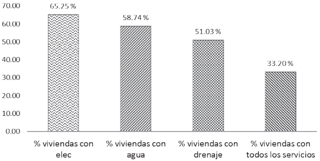 El crecimiento de la vivienda ha aumentado anualmente en Oaxaca; registraba 1’518,989 viviendas en 2015; de las cuales, el 65.25% contaba con electricidad, el 58.74% con agua, el 51.03% con drenaje y 33.20% con todos los servicios (figura 3). A pesar de ello, en 2011, Oaxaca estaba en el último lugar nacional en financiamientos otorgados para la vivienda, con un déficit de 330 mil viviendas, según la Comisión Nacional de Vivienda (CONAVI); y sólo contaba con 536 créditos, 14% de lo contemplado por el Instituto del Fondo Nacional de la Vivienda para los Trabajadores (Infonavit) (Silva, 2011). Para 2017, de acuerdo con el programa dirigido a los trabajadores afiliados al Instituto de Seguridad y Servicios Sociales de los Trabajadores del Estado (ISSSTE), se cuenta con 15 mil millones de pesos y 30 mil créditos; 2 mil millones de pesos destinados a la construcción de vivienda, lo cual significa un gran apoyo generando alrededor de 50 mil empleos; asimismo, con el apoyo de la Secretaría de Desarrollo Agrario Territorial y Urbana (SEDATU), se busca mejorar la accesibilidad a los créditos sin obstáculos burocráticos, como la corrupción de líderes sindicales, según la revista Milenio (Rodríguez, 2017).