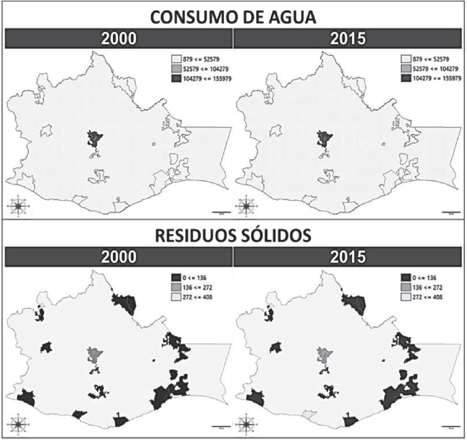 Con relación al tema ambiental en el SCOAX, representado por indicadores como el consumo de agua y la generación de residuos sólidos urbanos (figura 5), se observa que entre el 2000 y el 2010 existió un valor constante en ambos indicadores en todos los años, pero con un impacto destacado en la ZMO correspondiente a la región de Valles Centrales, sólo surgiendo un crecimiento en la generación de residuos sólidos para Puerto Escondido, ciudad ubicada en la región de la Costa. Por otra parte, de acuerdo con los registros de la CONAGUA (2014), Tuxtepec resultó la ciudad con la mayor cantidad de agua extraída, y las ciudades de Ixtepec, Matías Romero y Puerto Escondido con la dotación de agua más baja para el uso en viviendas de las ciudades analizadas.