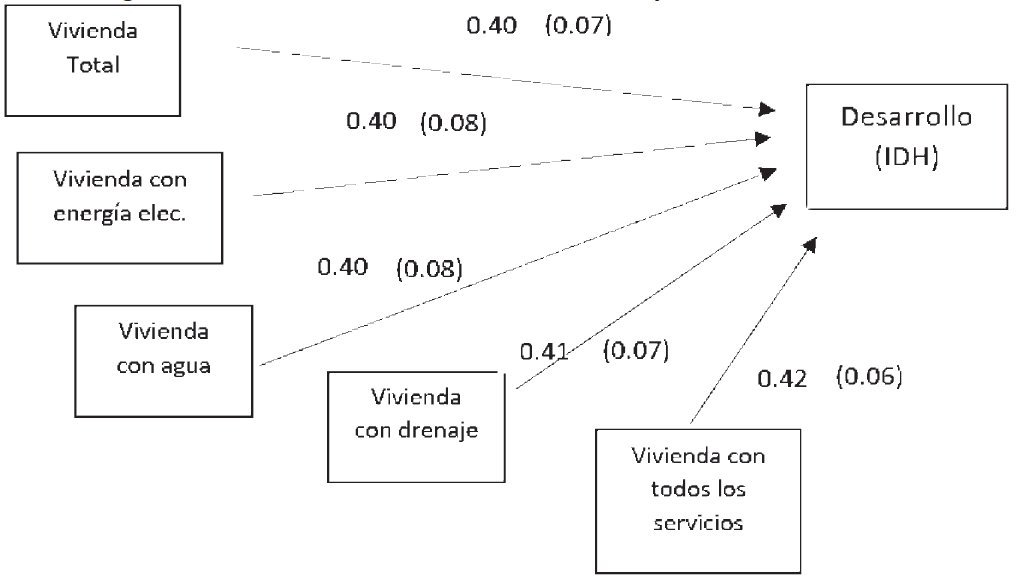 En el presente artículo, la hipótesis 1 evalúa el grado de asociación entre el total de viviendas y el desarrollo; la hipótesis 2 evalúa el grado de asociación entre la vivienda con servicios parciales y el desarrollo; y la hipótesis 3 evalúa el grado de asociación entre la vivienda que cuenta con todos los servicios y el desarrollo. En la figura 6 se muestran los resultados obtenidos.