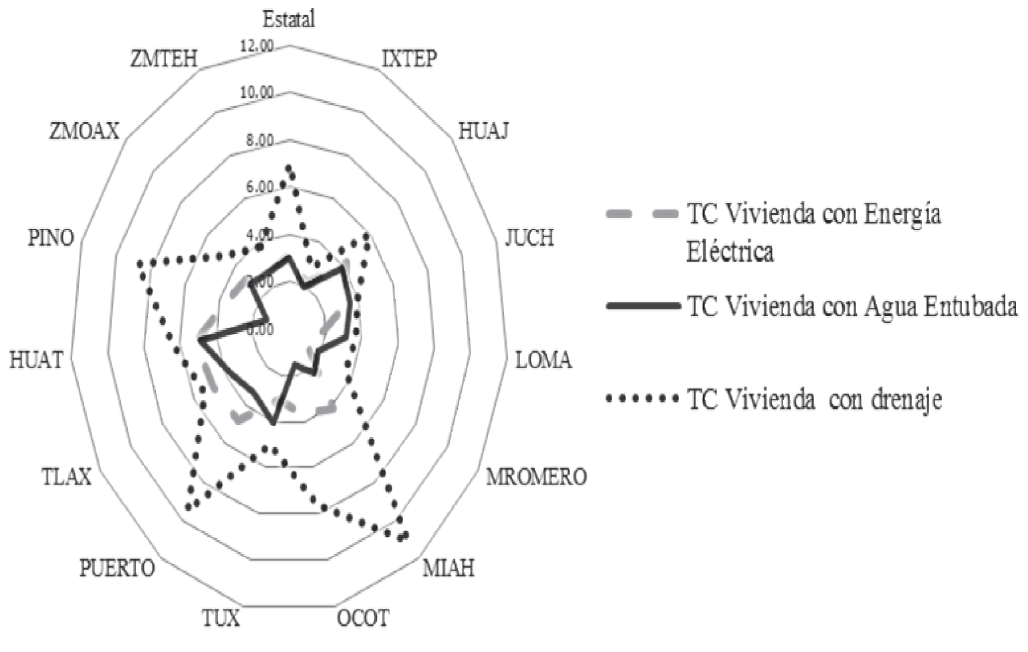 Respecto a los servicios, y de acuerdo con su tasa de crecimiento, las viviendas en el SCOAX muestran un mayor equipamiento de electricidad y agua en Huatulco, y la disponibilidad del servicio de drenaje en Miahuatlán (figura 4).