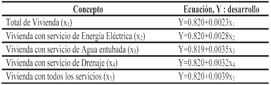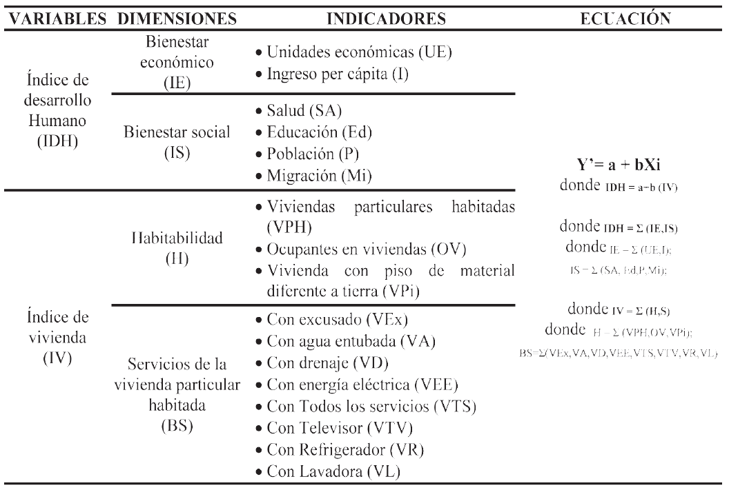 El análisis de la información se basa en un enfoque cuantitativo derivado de la aplicación de la técnica “estadística de regresión” para obtener la asociación existente entre las variables Y “desarrollo” (IDH), y Xi “vivienda” (IV) (total, con servicios parciales y con todos los servicios). Este análisis desarrolla un modelo matemático que expresa la relación entre dos variables y estima el valor de la dependiente. A la ecuación obtenida se le llama “ecuación de regresión lineal”, y se emplea el “método de mínimos cuadrados”, basado en la minimización de la suma de los cuadrados de la distancia vertical entre el valor real de Y y el valor predictorio de Y (la siguiente ecuación representa la forma general de la ecuación lineal de regresión).
