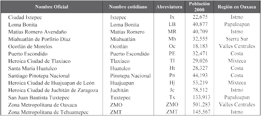 Las ciudades analizadas en el presente artículo se denominan “sistema de ciudades de Oaxaca” (SCOAX) como se muestran en el cuadro 3, en el que se indica el nombre oficial y el nombre cotidiano; éste último es el que se utilizará a lo largo del texto, con excepción de la Zona Metropolitana de Tehuantepec y la Zona Metropolitana de Oaxaca que se denominarán con las abreviaturas ZMT y ZMO.