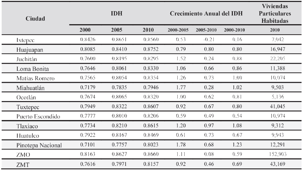 El IDH de las ciudades se integra con los subíndices de salud, educación e ingreso. Todas las ciudades del SCOAX poseen un nivel de desarrollo alto, con valores de un IDH por encima de 0.80. Específicamente, para 2010 el IDH en las ciudades de Oaxaca fue superior a 0.80 excepto para Miahuatlán (0.79) y Pinotepa Nacional (0.80). La ZMO con un IDH de 0.90 presenta el mayor valor de este indicador. Para el 2015, los valores del IDH en el SCOAX muestran crecimiento ascendente, excepto para Ixtepec, cuyos registros fueron de 0.84.
