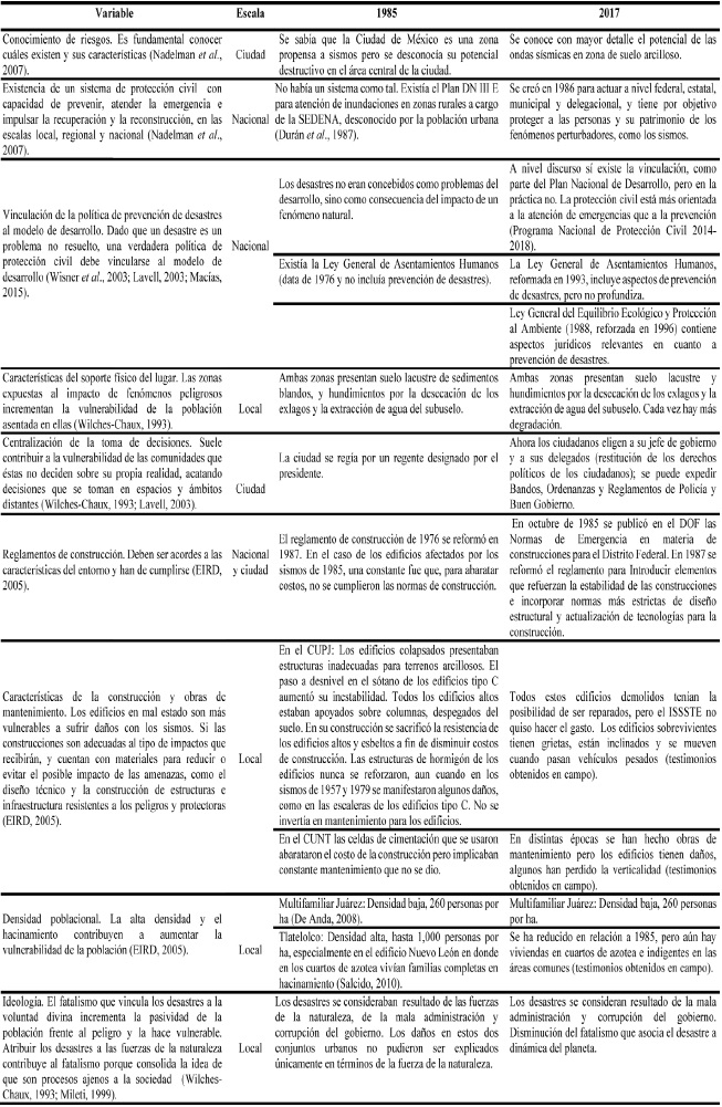 La información se obtuvo de fuentes bibliográficas, hemerográficas y testimoniales (Loaeza, 2010; Salcido, 2010); esta última de vecinos, exvecinos y actores clave, proporcionados específicamente para esta investigación en 2011 y en 2017, los cuales sirvieron para corroborar y detallar la información obtenida. Respecto a la vulnerabilidad, se consideraron: el conocimiento de los riesgos existentes, la existencia y el funcionamiento de un sistema de protección civil, la vinculación de la política de prevención de desastres al modelo de desarrollo, las características del soporte físico del lugar, la centralización de la toma de decisiones, la existencia y pertinencia de los reglamentos de construcción y la ideología, variables de gran importancia y utilidad según Wilches-Chaux (1993), Mileti (1999), Lavell (2003), Wisner et al. (2003), Nadelman et al. (2007), Macías (2015) y la EIRD (2005).