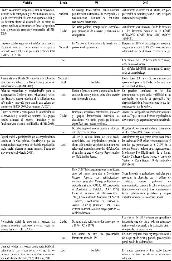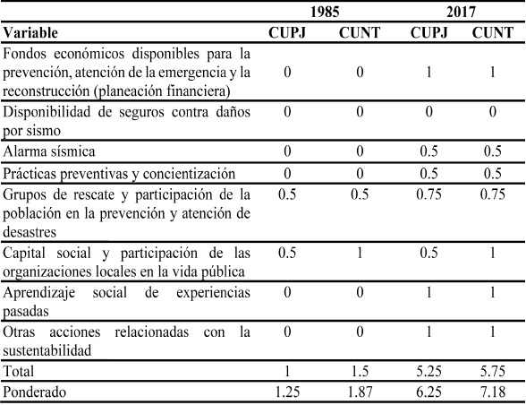 Para el análisis de la resiliencia se consideraron: los fondos económicos disponibles para la atención de la emergencia y la reconstrucción, la disponibilidad de seguro contra daños por sismo, la existencia y el funcionamiento de alarma sísmica, las prácticas preventivas y de concientización, los grupos de rescate y participación de la población en la prevención y atención de desastres, el capital social disponible y la participación de las organizaciones sociales en la vida pública, el aprendizaje social de experiencias pasadas, y las actividades relacionadas con la sustentabilidad, cuyas variables se retomaron de las propuestas de García (2009), Cutter et al. (2010), McEntire (2011) y la EIRD (2005).