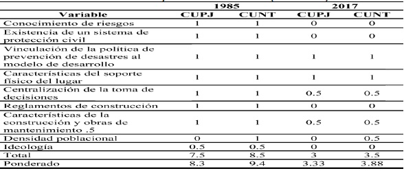 En los cuadros 4 y 5 se presentan los resultados del análisis. En 1985, en ambos conjuntos, la vulnerabilidad era muy alta; el CUPJ alcanzaba ocho puntos de diez y nueve el CUNT, que se reducen a cuatro y cinco, respectivamente para 2017; esto indica que la vulnerabilidad ha disminuido en términos generales, aunque es constante en las características físicas del soporte del lugar; es decir, los conjuntos urbanos en estudio se asientan en zona sísmica, en exlagos, ahora desecados. El entorno ambiental degradado de la Ciudad de México (Ezcurra et al., 2006) contribuye a la vulnerabilidad de la población al magnificar el impacto de los fenómenos naturales (McEntire, 2011); por ejemplo, el hundimiento de varios centímetros de la ciudad al año contribuye a agravar el impacto de los sismos (Nadelman et al., 2007). El deterioro es muestra de la insostenibilidad ambiental de la Ciudad de México.