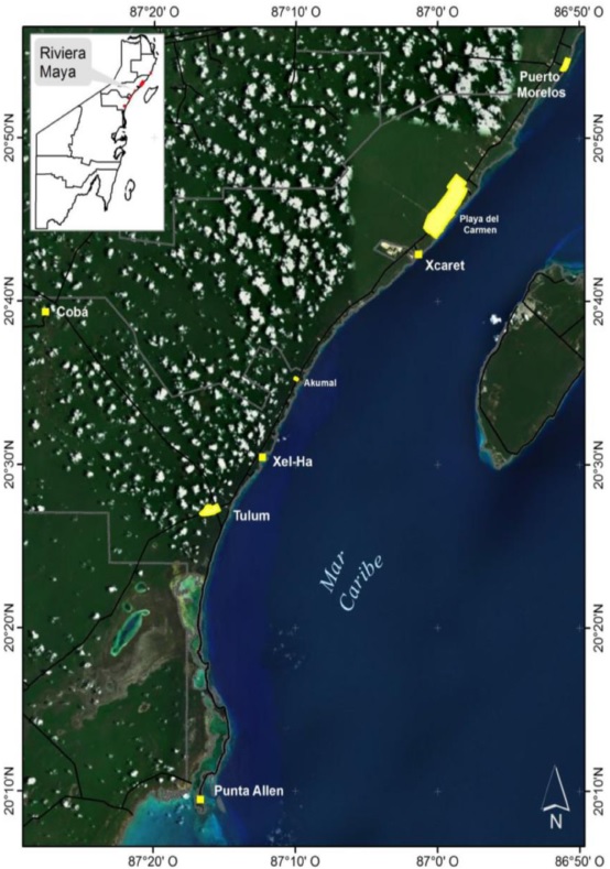 La Riviera Maya es una zona turística de México situada a lo largo del Mar Caribe en el estado de Quintana Roo; geográficamente se extiende a lo largo del litoral desde la localidad de Puerto Morelos, al norte, hasta la localidad de Punta Allen, al sur; unos 140 km de longitud. Existen alrededor de 405 hoteles de clase internacional, 5 estrellas y otras categorías, que ofrecen al menos 43,500 habitaciones (H. Ayuntamiento de Solidaridad, 2016). Originalmente se llamó Corredor Cancún-Tulum y en 1999 se le cambió por el nombre actual. Debemos partir de Quintana Roo, y por ende su destino Riviera Maya, cuya fortaleza es el turismo, actividad que en las últimas décadas se ha desarrollado de manera impresionante (H. Ayuntamiento de Solidaridad, 2016).