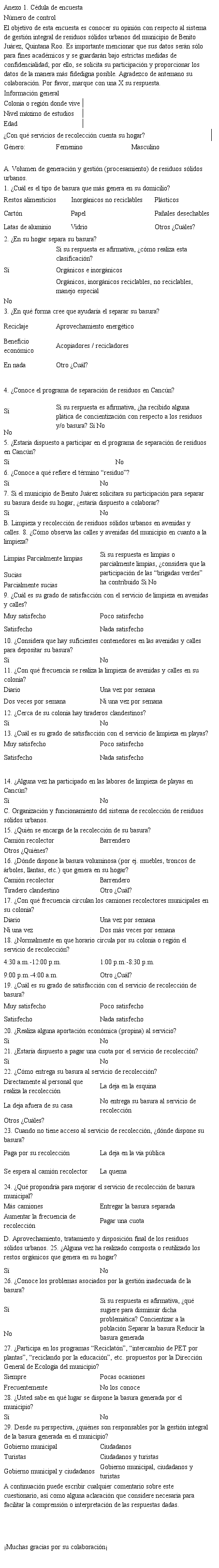 La intención inicial de estudiar la estructura, funcionamiento y organización del Sistema de Gestión Integral de Residuos Sólidos Urbanos (SiGIRSU) en el municipio de Benito Juárez generó como propuesta metodológica que partió de una revisión y análisis de documentos especializados, para luego identificar y reajustar una serie de veinte indicadores ambientales divididos en cuatro dimensiones propuestas para su análisis y medir a partir de éstas el índice de eficiencia, tomando como base la percepción de los ciudadanos respecto a la gestión de los residuos a partir de una encuesta que permitiera conocer la frecuencia, eficiencia y calidad de servicios del manejo integral de los residuos por zonas. El levantamiento de la encuesta se llevó a cabo entre enero y marzo de 2018.[1]