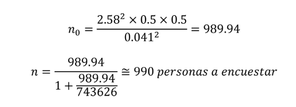 Para el levantamiento de la encuesta, se determinó inicialmente el tamaño de muestra a través de un muestreo probabilístico y la selección fue de forma aleatoria, en apego estricto a los criterios del muestreo determinístico, cuyos parámetros encajan con las variables a considerar en esta investigación de carácter exploratorio. A su vez, el cuestionario que fungió de base constó de 29 preguntas –en su mayoría cerradas–, divididas en función de las cuatro dimensiones del SiGIRSU (ver anexo 1). Fue aplicado en calles, avenidas y lugares concurridos del municipio. La muestra se eligió con un nivel de confianza de 99%, dando como resultado un tamaño de 990 encuestados a partir de las siguientes fórmulas (Quezada, 2015):