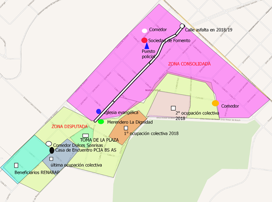 A su vez, el barrio presenta determinadas condiciones de posibilidad para el acceso alternativo a la tierra que lo vuelve un territorio diferencial a otros barrios de la ciudad, habiendo una disputa constante por el control y la apropiación de los terrenos. De esta forma, se observan diferentes lecturas territoriales –prevaleciendo la estatal– y su superposición, como territorios-lugares en constante transformación atravesados por la política barrial y la puja de éstos como un elemento constitutivo de la ciudad en los márgenes.