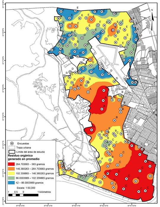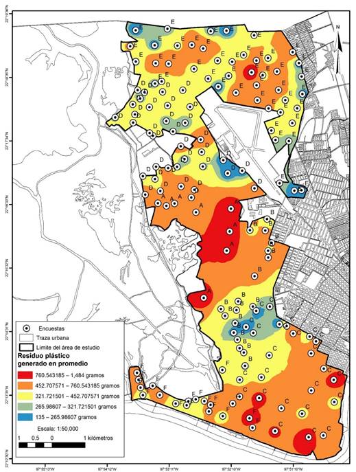 El mapa 1 muestra la generación promedio de RSU en toda la zona de estudio, la cual se obtuvo a partir del muestreo de basura generado por hogar, por cada día de la semana. Se pueden observar las áreas marcadas de rojo que representan el rango más alto de cantidad de residuo generado, seguidas por las áreas de color naranja, amarillo, verde y azul, que corresponden a rangos menores. Se advierte que la zona con mayor cantidad de residuos generados es la zona centro, seguida de la zona sur, y, finalmente, la zona norte; esto se podría explicar debido a la alta concentración de comercios, restaurantes y bares, así como a la ubicación de los mercados municipales en la zona centro, lo que genera un flujo constante de personas y mayor actividad económica y, por ende, mayor generación de residuos.