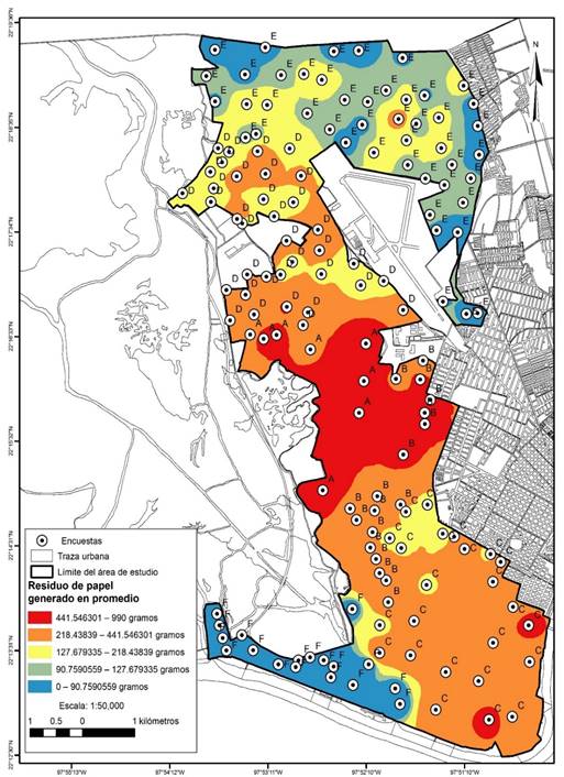 En el mapa 13 se indica el promedio de papel generado. Se muestra que este residuo se genera en casi todo el territorio en cantidades similares o dentro del mismo rango. No sólo se presenta en las áreas como el centro, sino también en el área del norte; y en el suroeste, se observa la menor generación de este residuo.