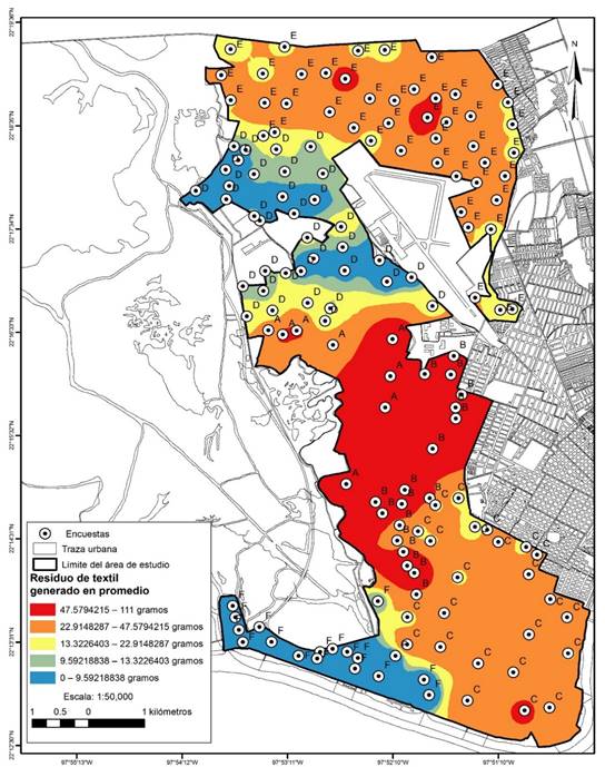 En el mapa 14 se señala el promedio de generación de textil; este residuo es ropa; aunque se manifiesta en casi toda la zona, en el área central del polígono es donde se muestra la mayor generación, que es donde se ubican los hogares con mayor ingreso. En contraste, en el área sur del polígono se presenta la menor cantidad de residuo textil; zona donde se ubican los hogares con menor ingreso.
