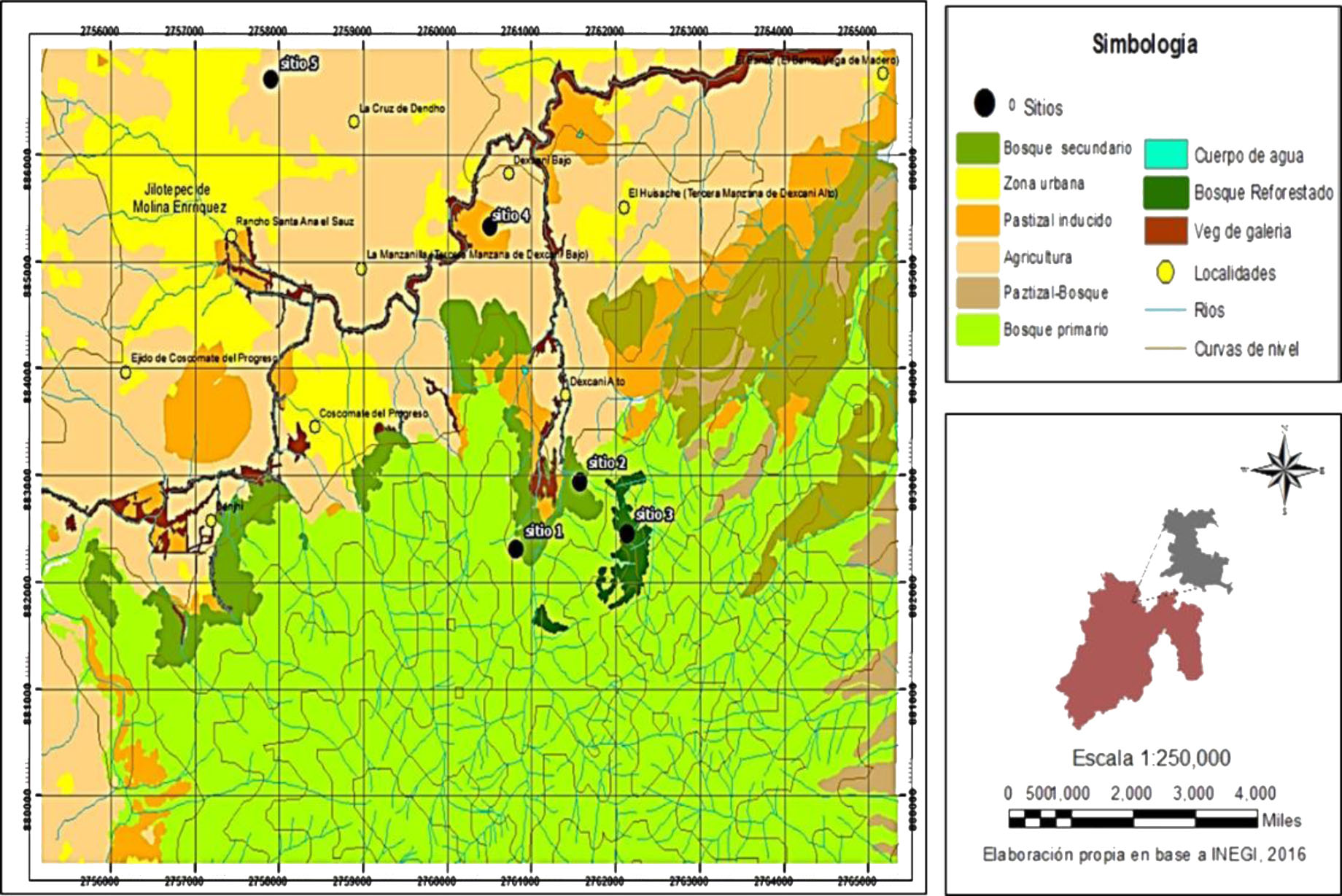 Para llevar a cabo esta investigación, se realizó un análisis geomorfológico para delimitar un transecto representativo de las diferentes unidades de paisaje y uso de suelo dentro de un rango de los 2,420 a los 2,650 msnm; se identificaron cinco condiciones de uso de suelo: Bosque Conservado (BC), Bosque Secundario (BS), Bosque Reforestado (BR), Pastizal Inducido (PI) y Agricultura de Riego (AR).