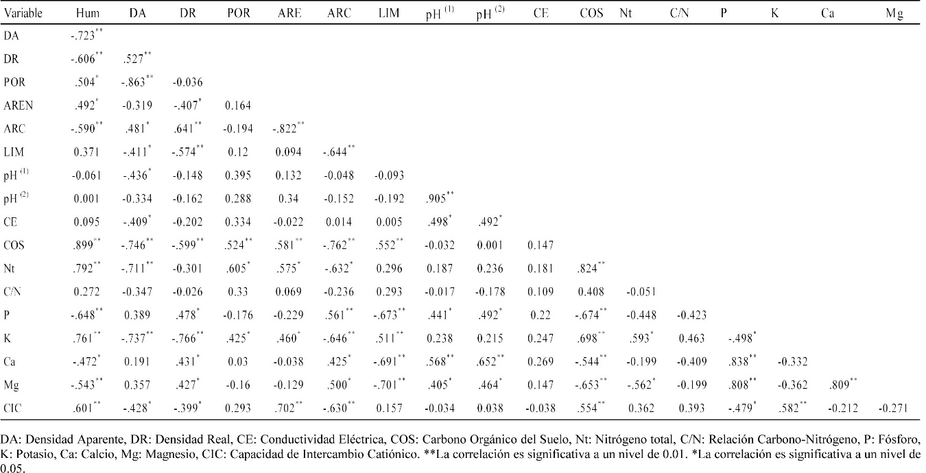 El análisis de correlación lineal de las 17 propiedades del suelo identificó un total de 153 interacciones; de las cuales, 73 resultaron significativas (48%) (P< 0.05) (cuadro 1), lo cual indica que estos atributos del suelo pueden ser agrupados en componentes basados en sus patrones de correlación. El COS fue la variable con mayor número de interacciones significativas (13), seguido de la fracción de arcillas, K y DA (12, 11 y 10, respectivamente).