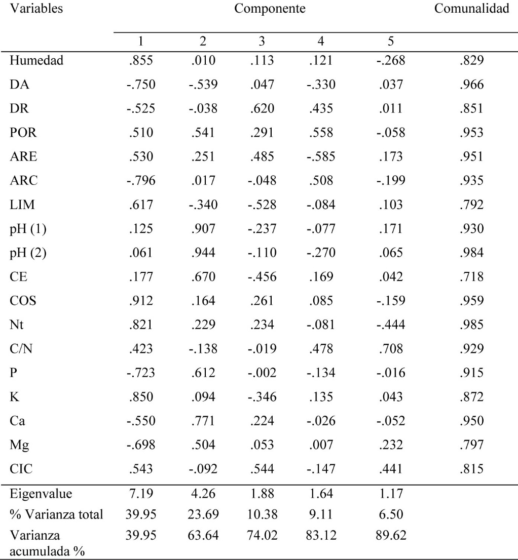 Siguiendo los procedimientos propuestos por Ghaemi et al. (2014), Jamioy, Menjivar y Rubiano (2015); Yang et al. (2016) y Teferi et al. (2016), y con objeto de reducir el sistema de variables a un grupo mínimo de indicadores que pudieran explicar la variabilidad inherente a la calidad de los suelos de estos sistemas ambientales, se realizó la prueba de análisis de componentes principales (ACP), calculado sobre la base de la matriz de correlación de variables.
