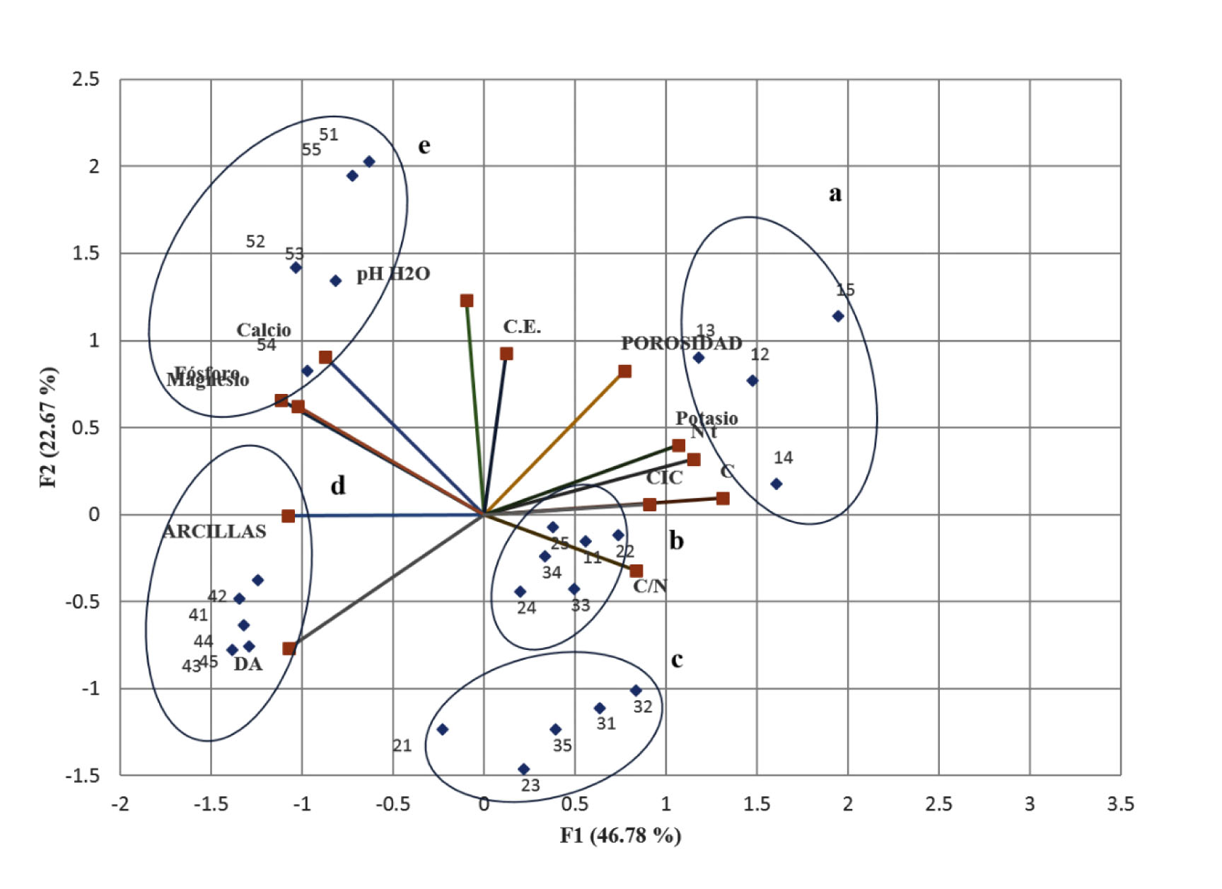 Cada CP responde a una combinación lineal de las variables originales y el valor propio asociado a cada variable representa la contribución de ésta al CP. Bajo este criterio, sólo fueron seleccionadas para la interpretación del CP las variables cuyo peso fuera > a 0.6. Posteriormente, para cada propiedad seleccionada, se efectuó un análisis de varianza de una vía, así como la prueba de Tukey para determinar la diferencia mínima significativa (p> 0.05) de las propiedades seleccionadas para los diferentes tipos y usos de suelo. Los análisis estadísticos se realizaron con los paquetes estadísticos PASW Statistics (V.18) y XLSTAT (V. 2017.1).