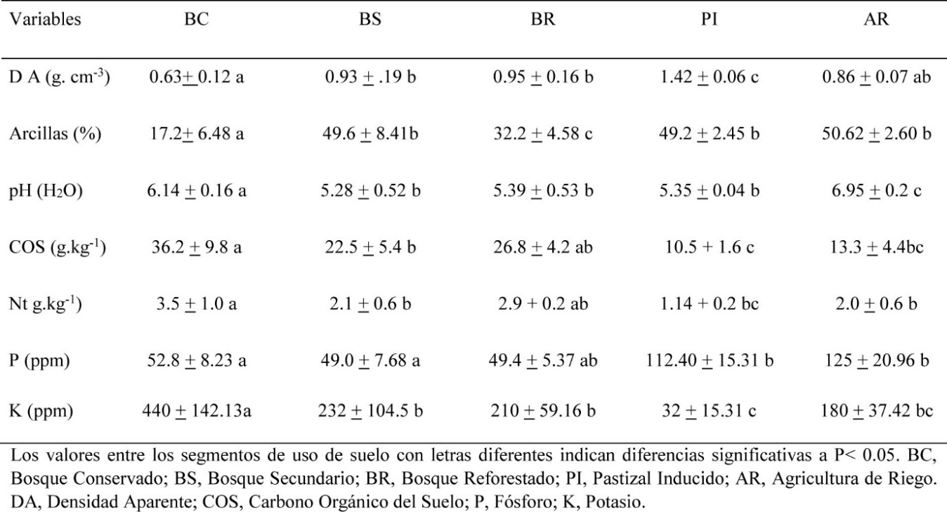 De manera general, en la zona de estudio predominan suelos superficiales con texturas medias y finas, cuyo contenido de arcillas fluctuó entre 17% y 50%, registrando el contenido más bajo para el suelo de BC y los más altos para BS, PI y AR. Esta variabilidad, si bien está relacionada con los procesos pedogenéticos que determinan la distribución de las unidades de suelo, en el caso de BS, el elevado contenido de arcillas en la capa superficial (estadísticamente similar a PI y AR) obedece a la remoción por erosión hídrica del horizonte A original, dejando expuesto el horizonte subsuperficial arcilloso (Bt), característico de los Luvisoles. La DA mostró diferencias significativas entre BC con respectos BS y BR, al igual que entre los suelos bajo uso agropecuario; este patrón es similar para la porosidad, por lo que, en primera instancia, el cambio de uso tiende a alterar estas propiedades considerando tanto los tipos de suelo como su uso actual.