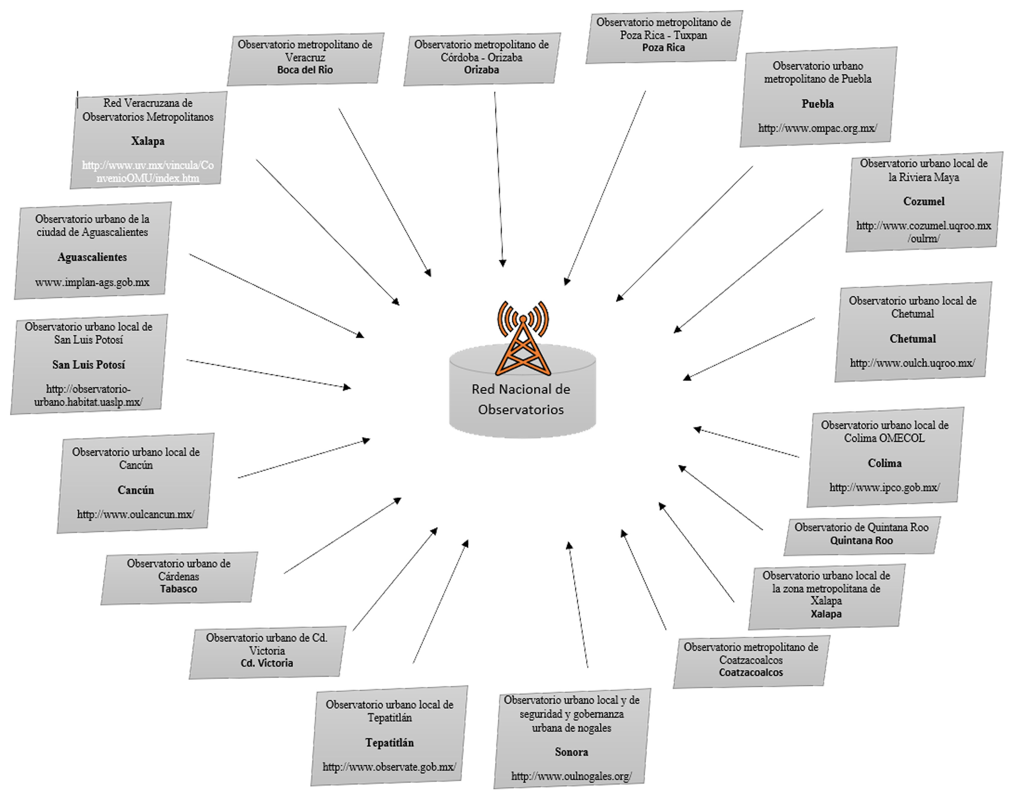 Para el 2007, la Red Nacional estaba conformada por 42 observatorios en funcionamiento; dentro de éstos, dos destacaban como redes estatales: el primero se encontraba en Aguascalientes y estaba conformado, a su vez, por 12 observatorios; la segunda red estatal se ubicaba en Veracruz y la conformaban cinco observatorios (Dirección General de Desarrollo Urbano y Suelo, 2018).