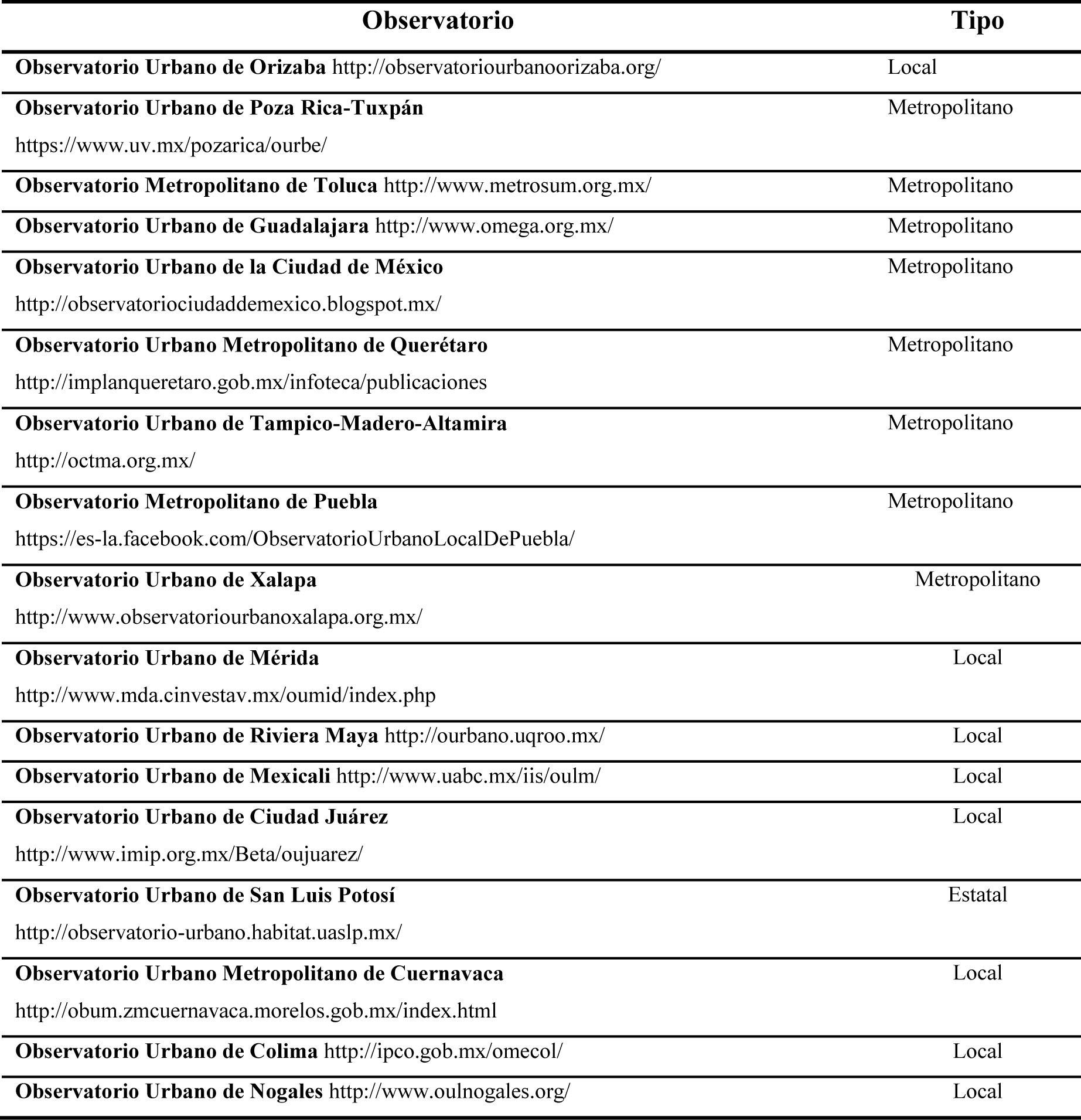 Con la finalidad de mejorar la información sobre los observatorios urbanos en funciones en el territorio mexicano, se desarrolló la tabla 2, en la cual se presentan a manera de lista los más destacados y de los que, hasta marzo de 2019, sus plataformas estaban en funcionamiento en Internet para la divulgación de sus principales resultados. Además, se menciona el tipo de observatorio de acuerdo con la extensión territorial que monitorea: local o metropolitano. El primer tipo hace referencia a los observatorios que se encuentran en una ciudad o municipio, y el segundo tipo son aquellos que agrupan a dos o más municipios que por sus características territoriales comparten información entre ellos.