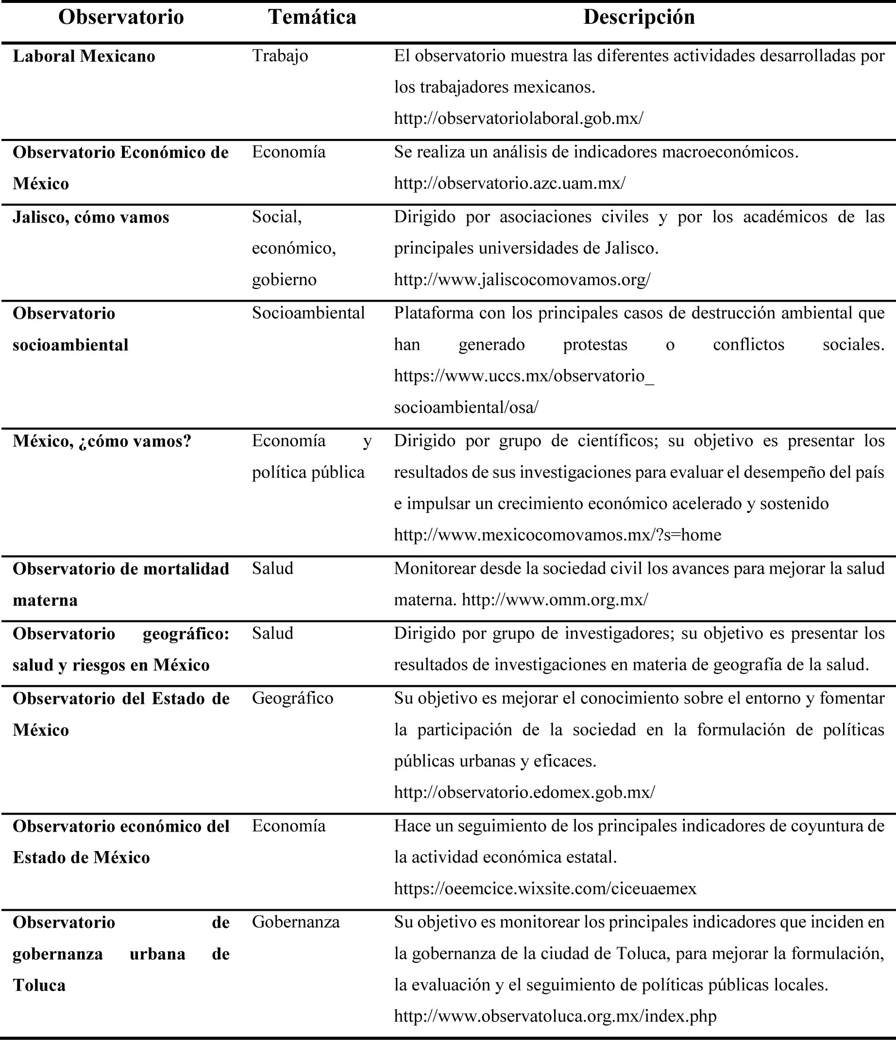 Para destacar de mejor manera la importancia de los observatorios como herramienta tecnológica, se investigó a través de diversos medios con el fin de obtener algunos casos que ilustren cómo el auge de los observatorios ha permitido su surgimiento desde distintos frentes, como sociedad civil, gobierno, iniciativa privada, entre otros, que además cuentan con diversas fuentes de información que les permiten realizar análisis y propuestas de mejora de las condiciones que se presentan en sus temáticas (la tabla 3 muestra los casos más destacados).
