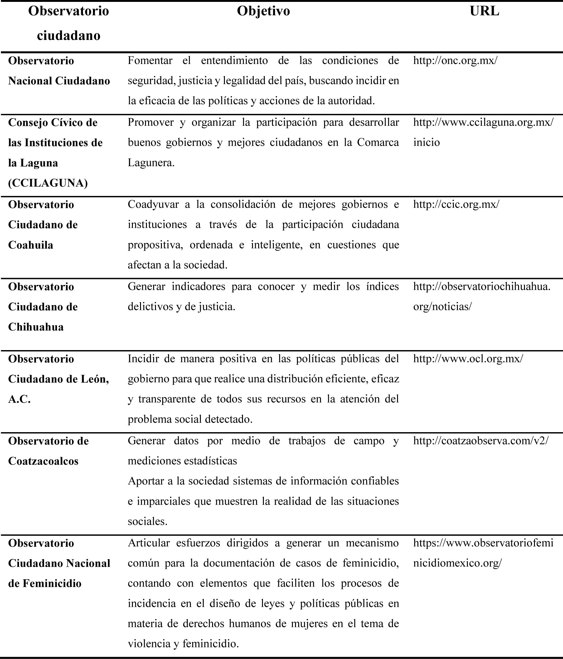 Como resultado del análisis realizado a los observatorios que han surgido con el tiempo, se elaboró la tabla 4, donde se enlistan algunos de éstos; se comienza con el Observatorio Nacional Ciudadano, pues concentra la mayor cantidad de resultados y funciona como nodo centralizador de los otros observatorios ciudadanos. La tabla indica el objetivo principal de cada uno y su trabajo, así como la dirección web.