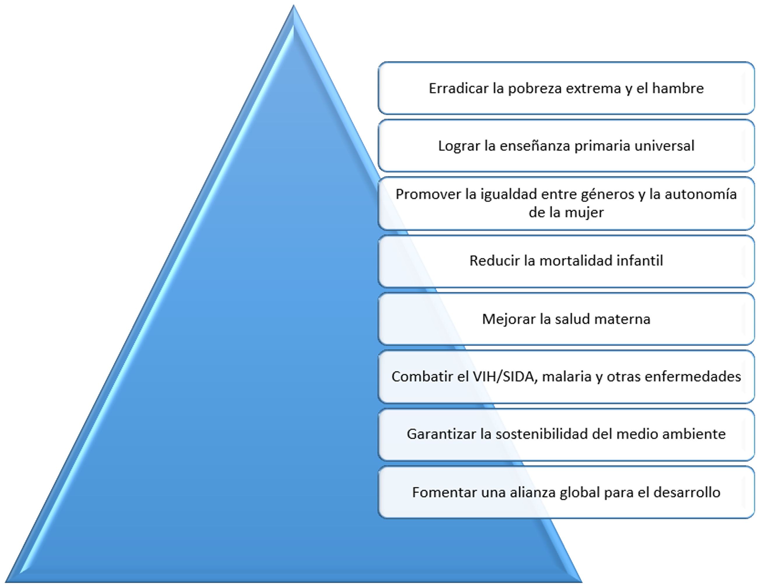 Para el año 2000, al objetivo principal de los observatorios urbanos se incorpora el tema de los asentamientos humanos a través de los Objetivos del Desarrollo del Milenio (ODM), los cuales buscan atender las necesidades más apremiantes y los derechos fundamentales que todos los seres humanos deberían disfrutar; para esto, se implementaron ocho objetivos de desarrollo (figura 1) a través del seguimiento de metas y el cálculo de indicadores. En el transcurso del tiempo, el número de metas e indicadores ha sufrido variaciones: para el 2002 se establecieron 21 metas y 48 indicadores cuantitativos, mientras que para el 2008 se incrementaron a 60 indicadores (SIODM, 2019).