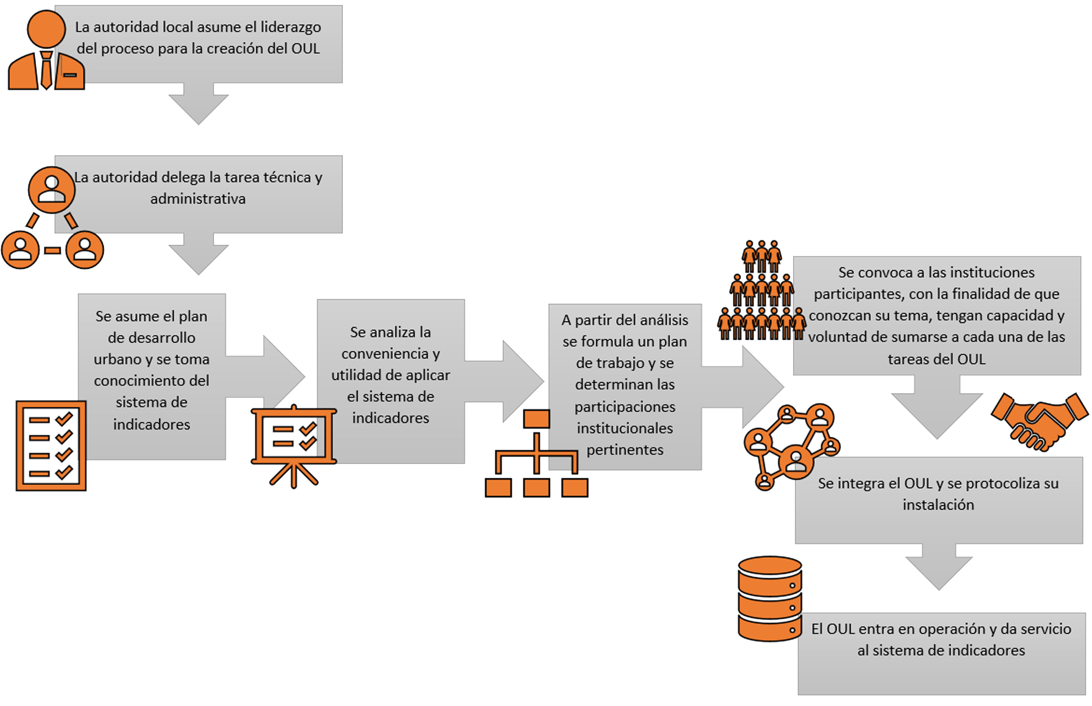 La SEDESOL estableció una guía metodológica para la constitución y la operación de las Agencias de Desarrollo Urbano y los Observatorios Urbanos Locales (Secretaría de Desarrollo Social, 2012), en la cual se detallan los pasos y las instancias participantes en la creación de un observatorio que desee pertenecer a la Red Nacional y recibir financiamiento por parte de la Secretaría (figura 3).