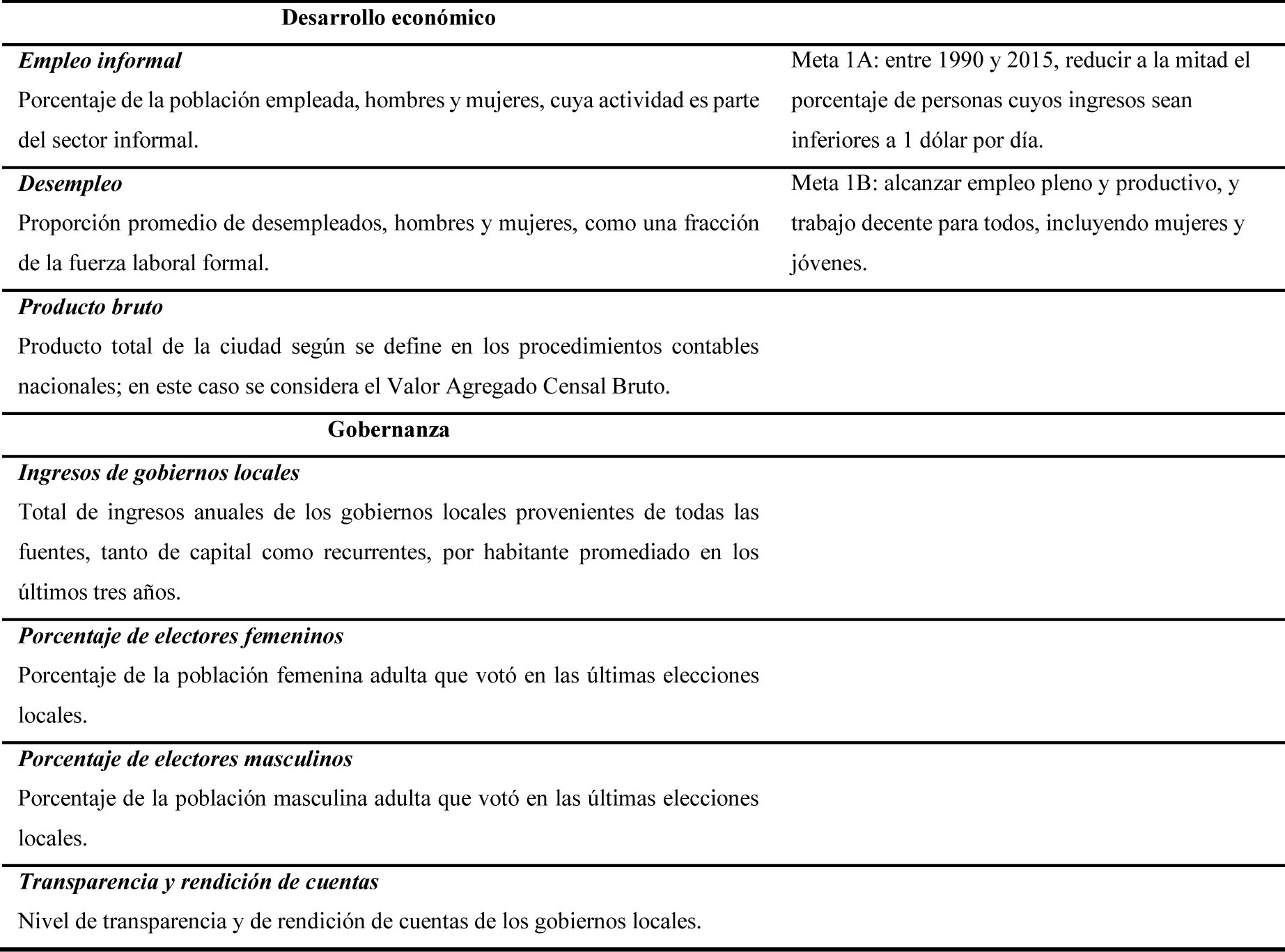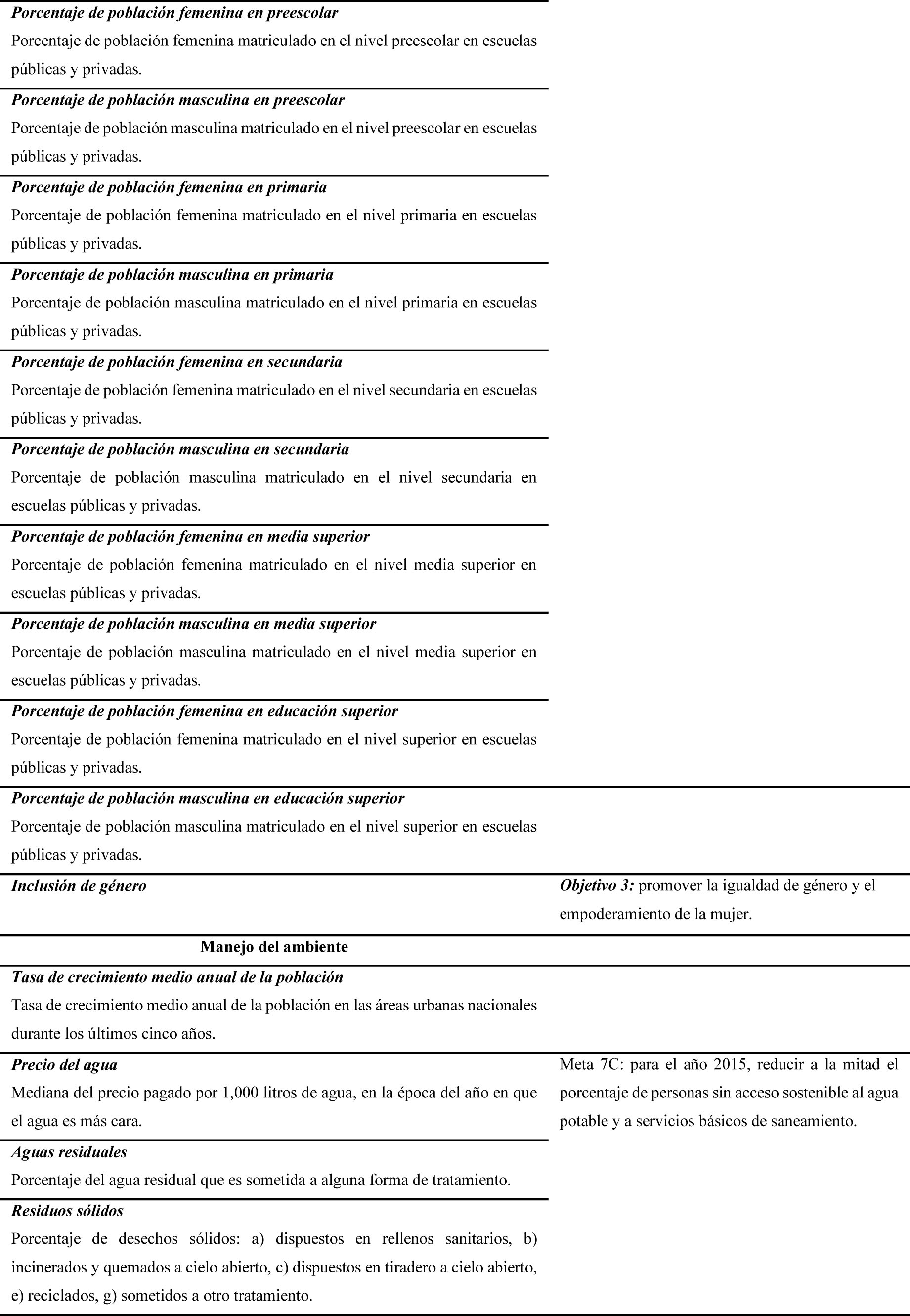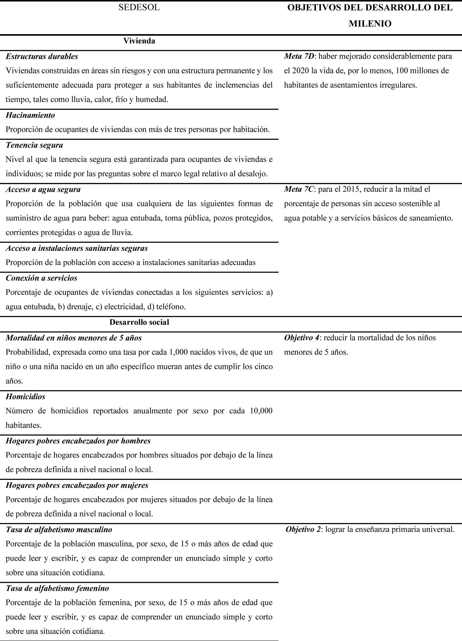 En la tabla 1 se desglosan los indicadores propuestos en la guía de la SEDESOL, así como su relación con ODM. Algunos observatorios establecieron indicadores adicionales que atendían las condiciones y necesidades particulares de cada entidad, municipio o ciudad, además de los recursos con los que contaban.