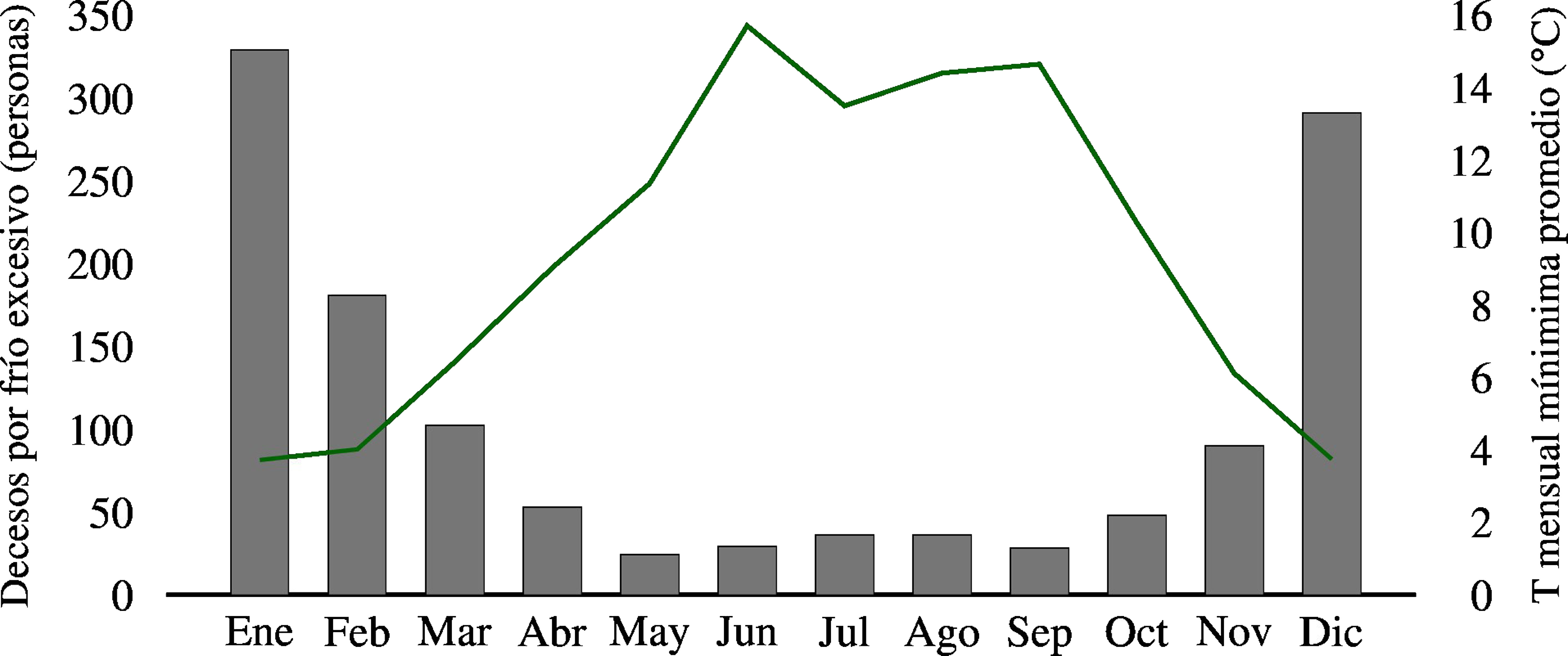 Durante el periodo analizado, se registraron un total de 1,207 muertes por frío natural excesivo; de las cuales, 801 (64.2% del total) ocurrieron en los meses de invierno (diciembre a febrero), bajo temperaturas en mínimas mensuales menores a 5°C (cuadro 1), y 127 (10.4%) en verano (junio a septiembre), bajo temperaturas por arriba de 14°C.
